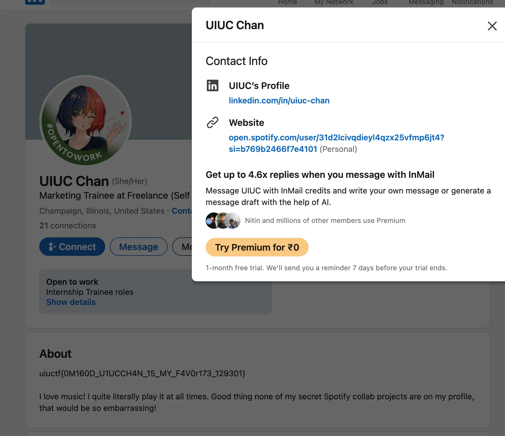 The flag is in the bio: uiuctf{0M160D_U1UCCH4N_15_MY_F4V0r173_129301}.