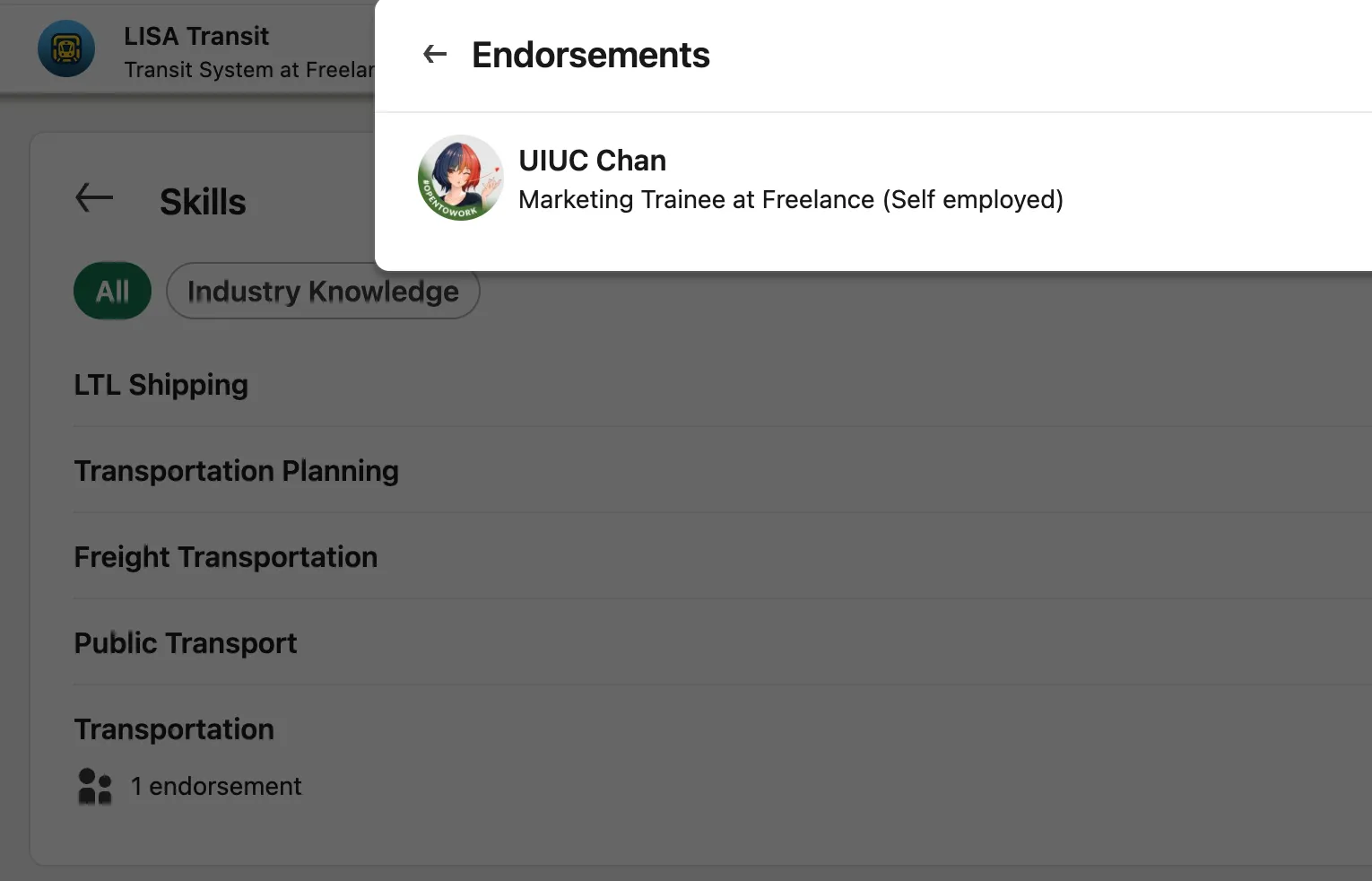 Viewing the one endorsement and visiting their profile: