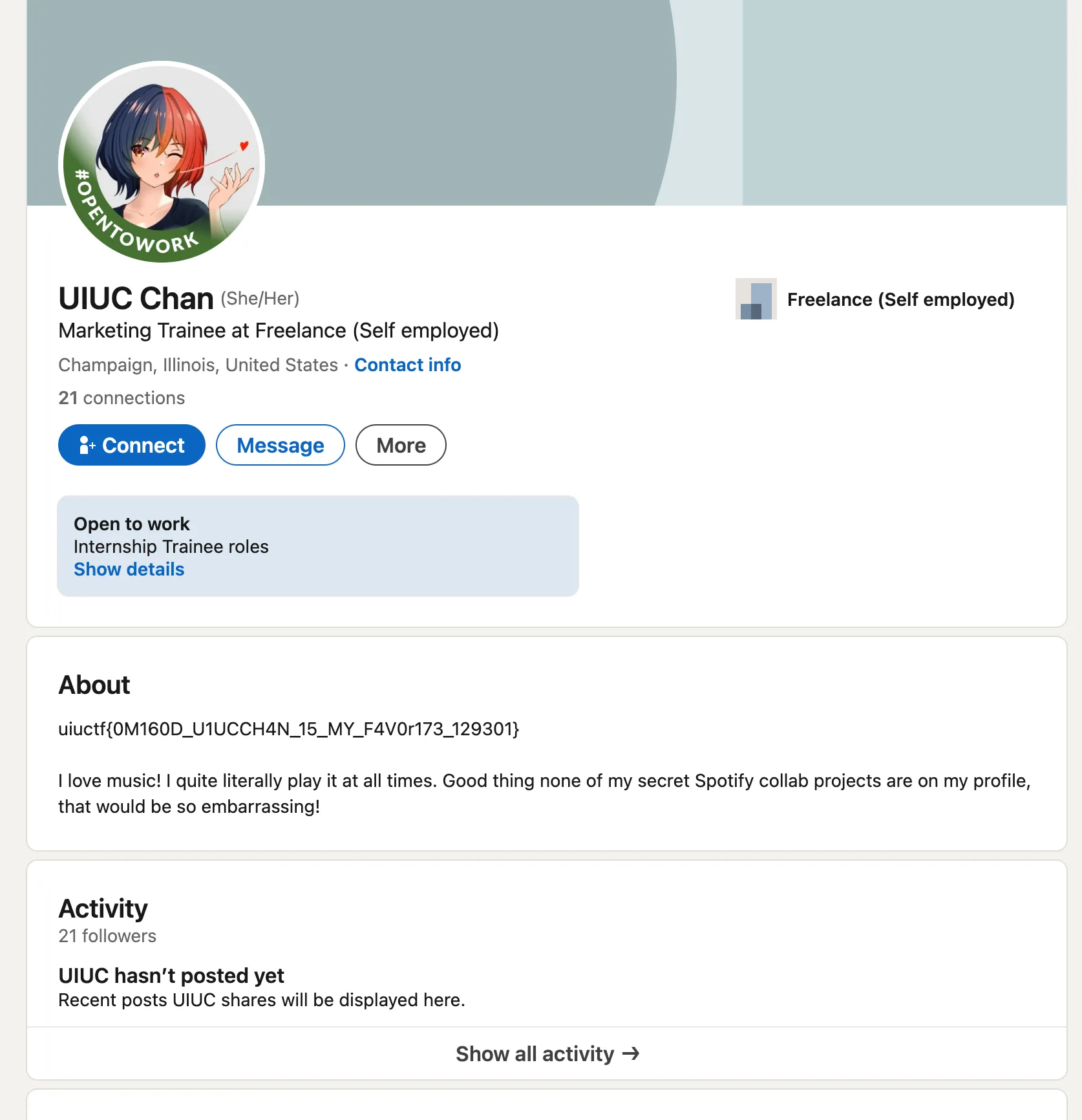Using data from the first challenge, I noticed a LinkedIn account in the bio of the Threads account. Going to the LinkedIn account, I got this page: